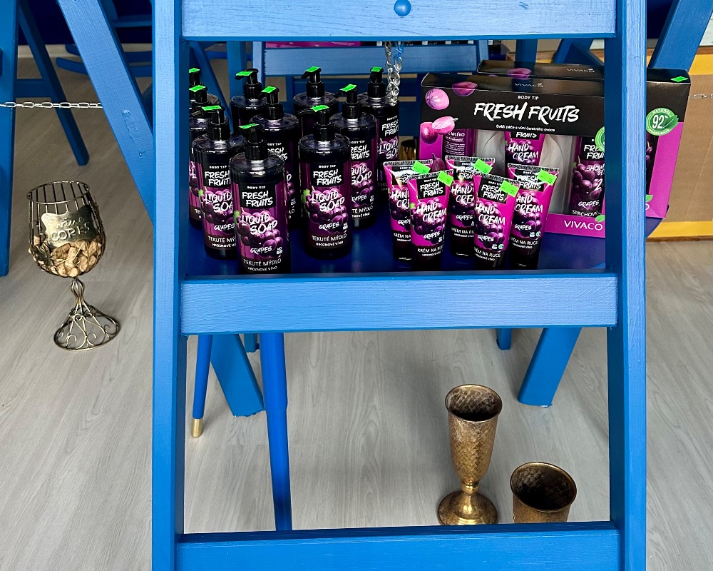 Zároveň chci, abyste mohli mít i nějaký hmatatelný zážitek, dá se u dá se u nás koupit i víno Pálava od místních vinařů, vinná kosmetika, stojany na víno a také další věci související s vínem.